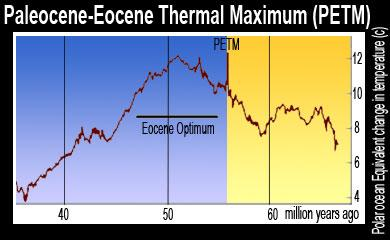 Data show that about 56 million years ago our planet got very warm. This period is shown in the chart labeled Paleocene-Eocene Thermal Maximum. It is a bit of a mouthful, which is why the abbreviation PETM is mostly used.