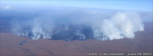 The photo from the Alaska Fire Service is of a huge Arctic fire in 2007 in northern Alaska that burned more than 400 square miles of tundra overlying permafrost. It is the largest on record and doubled the amount of tundra burned since 1950. Only the snows in October put it out. It released about 50 years of stored carbon. If we are reading the rocks right, our current rates of combustion of oil, coal and gas are setting the stage for some major climate event to occur.