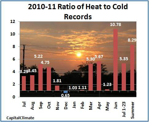 In a stable climate one might expect the ratio of "Heat to Cold" temperature records to vary around one. Only one month in the last 12 was below one (see December in the chart). But in June the ratio is almost 11:1 more heat records than cold records, and for the summer the ratio is 8:1. All these data are telling us something.