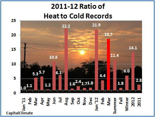 The heat records in March 2012 were unmatched in recorded history for both the U.S. and Canada. The ratio of 35.3 to 1, of highs to lows, is almost off the charts.