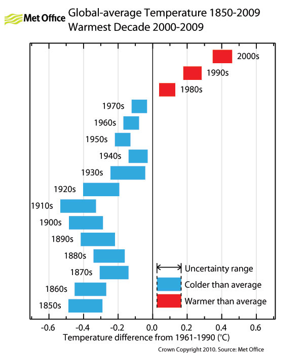 The data are very clear. The chart from the Meteorological Office, the climate research organization in England and part of the Defense Ministry, “Global Average Temperature 1850-2009,” gives the average decade temperatures for the past 160 years. Average temperatures are rising and the increases are primarily due to greenhouse gases whose levels are continuously increasing and have been for more